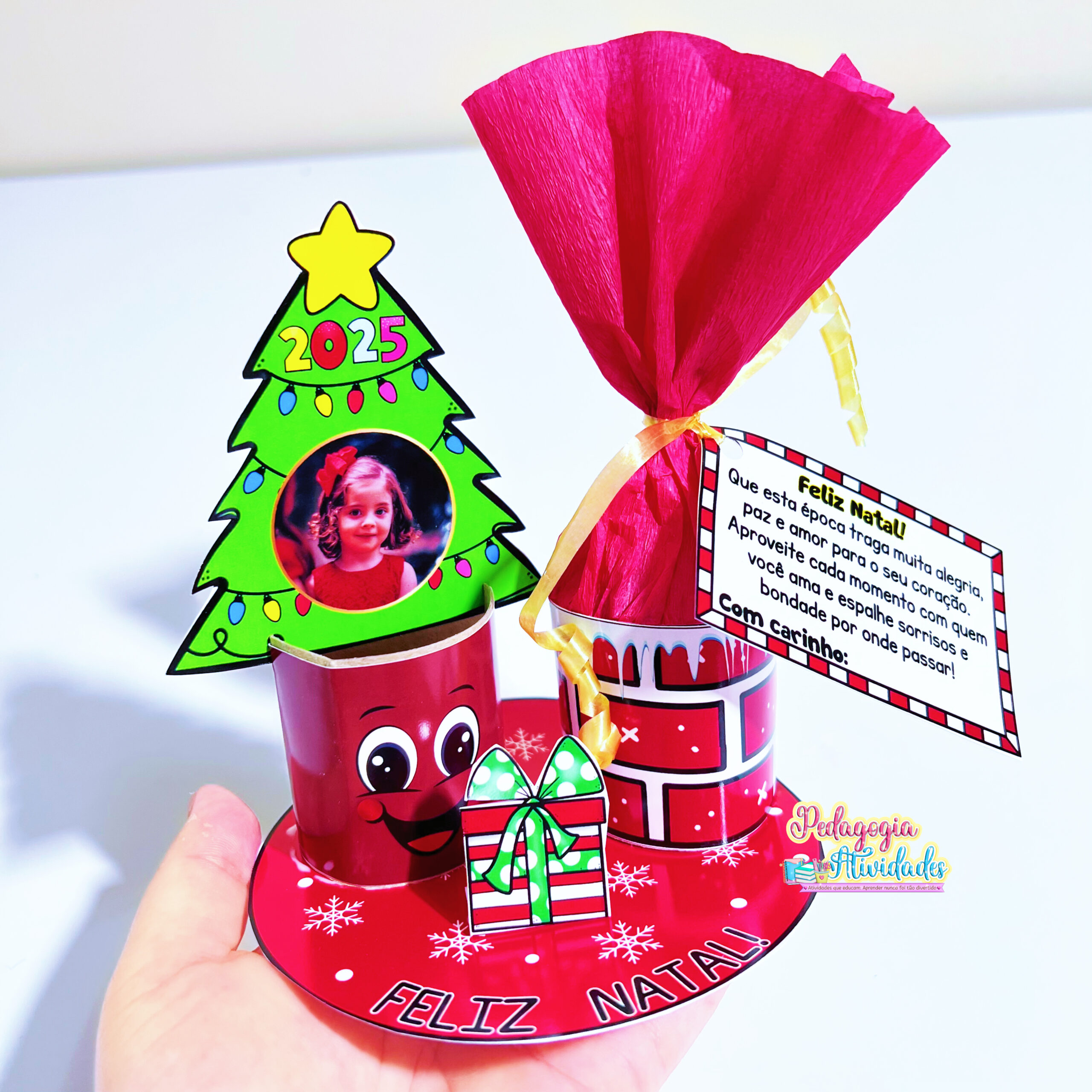 As crianças vão montar uma linda Árvore de Natal em 3D, feita com rolo de papel e decorada com papel crepom, formando uma chaminé super fofa — perfeita para guardar balinhas e pequenos doces! 🍬🎄
