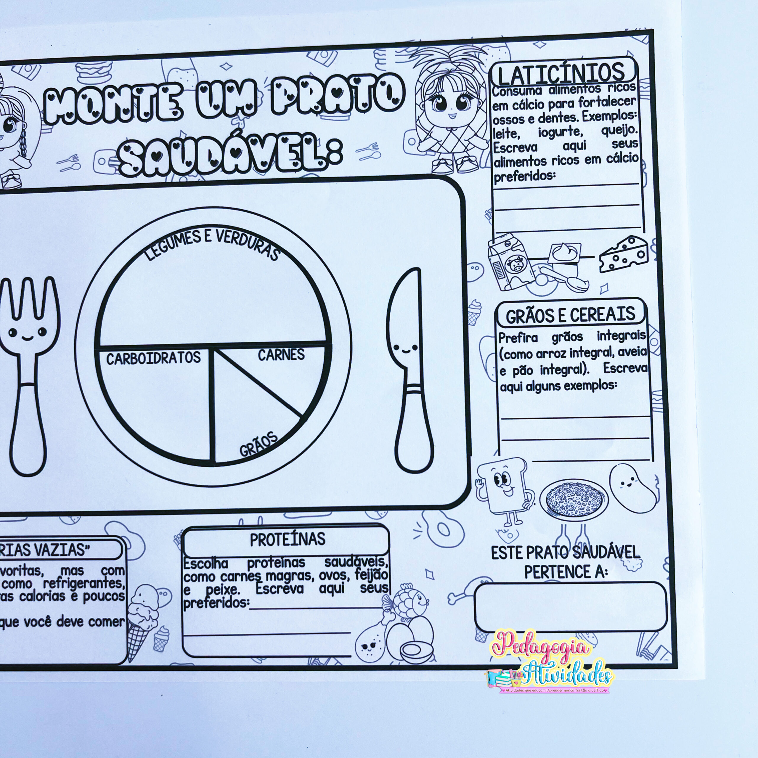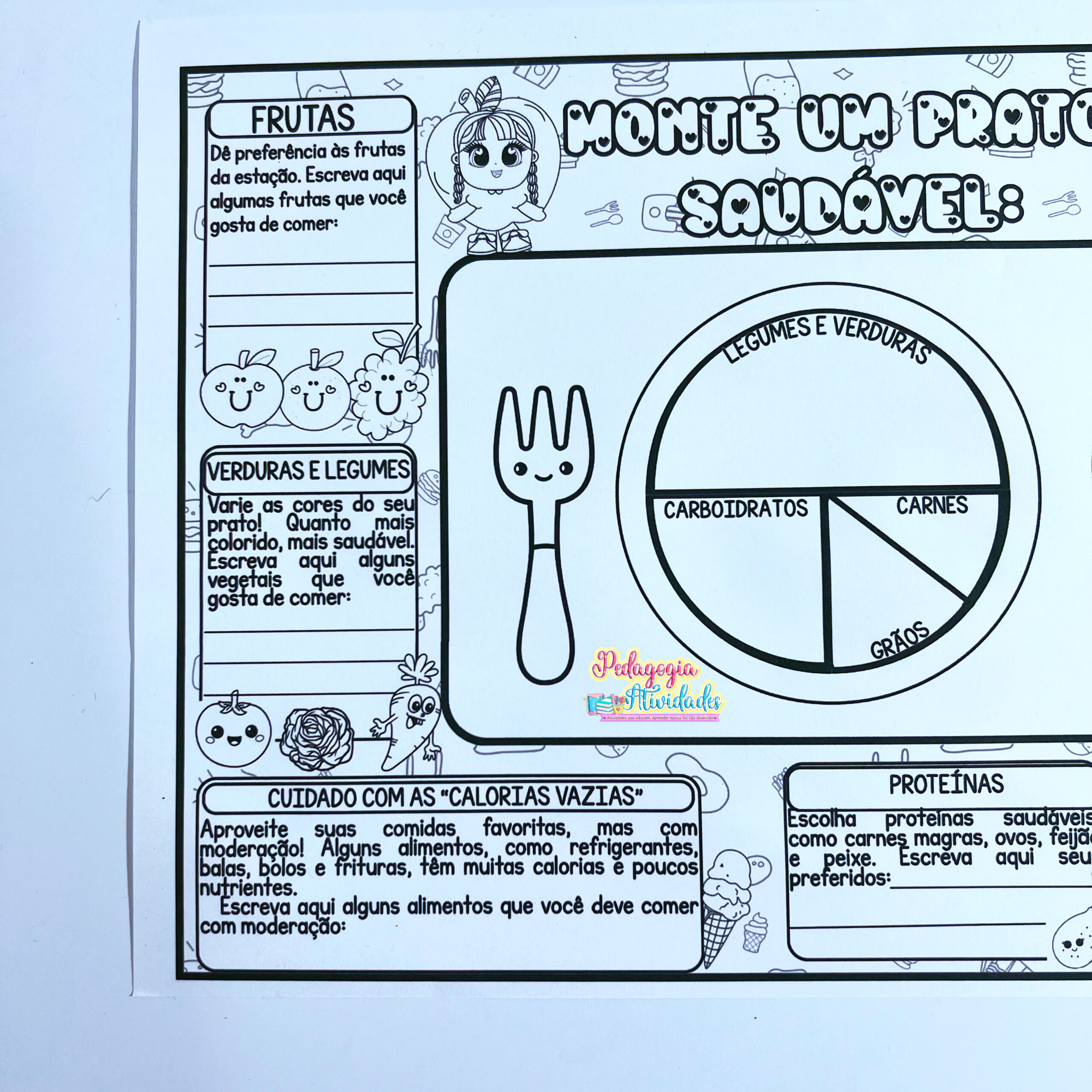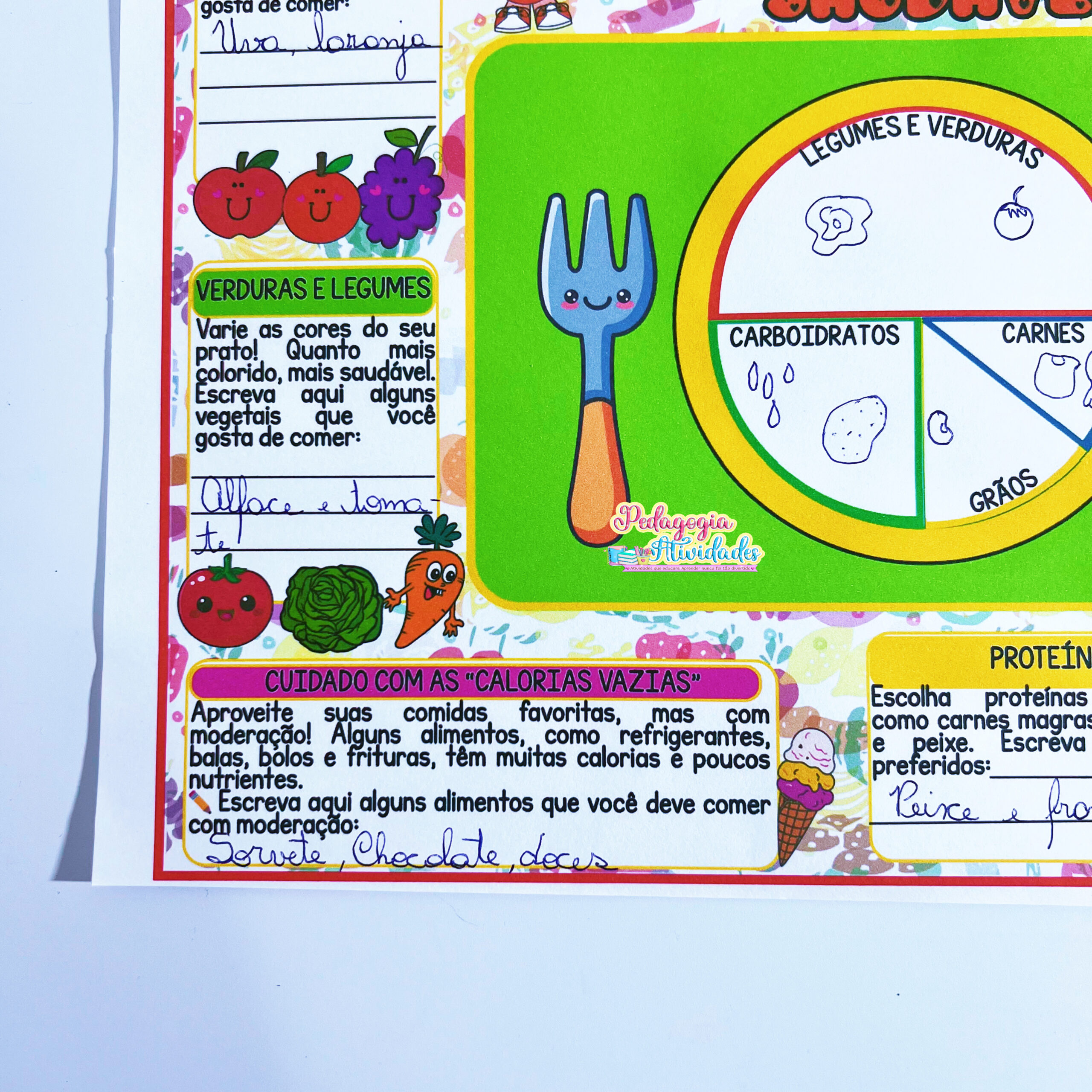 Cada espaço da folha convida à descoberta — frutas, verduras, proteínas, cereais e até as “calorias vazias” — tudo apresentado de maneira divertida e acessível para diferentes idades. 🍇🥕🍚
