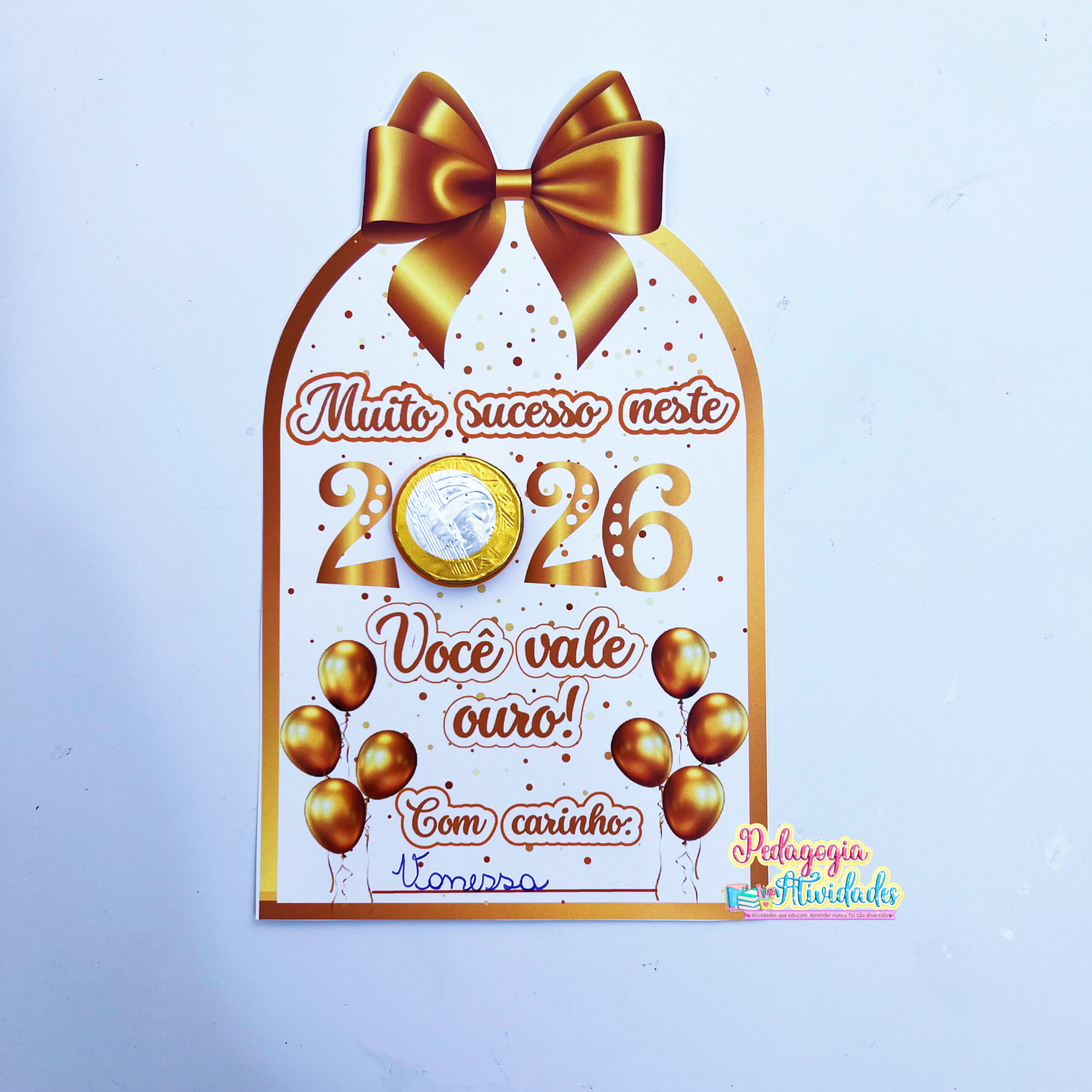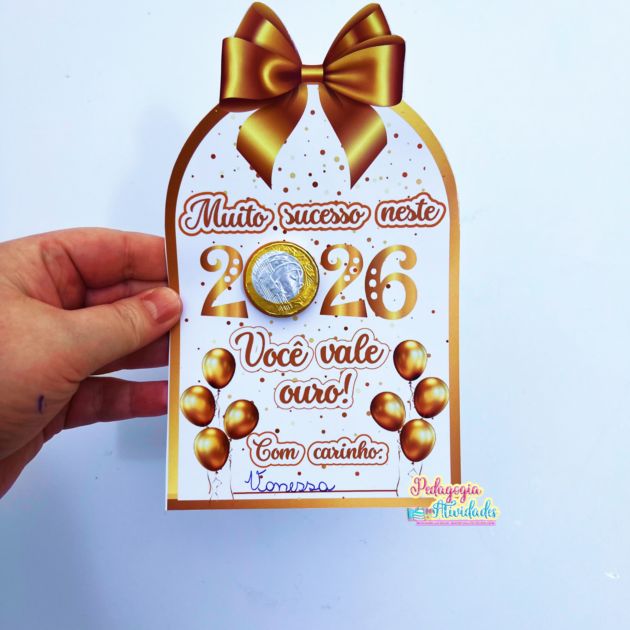 O Cartão “Muito Sucesso em 2026” é uma lembrancinha encantadora: no número “0”, a criança coloca uma moedinha de chocolate, simbolizando sorte, abundância e novos ciclos cheios de luz! ✨💛