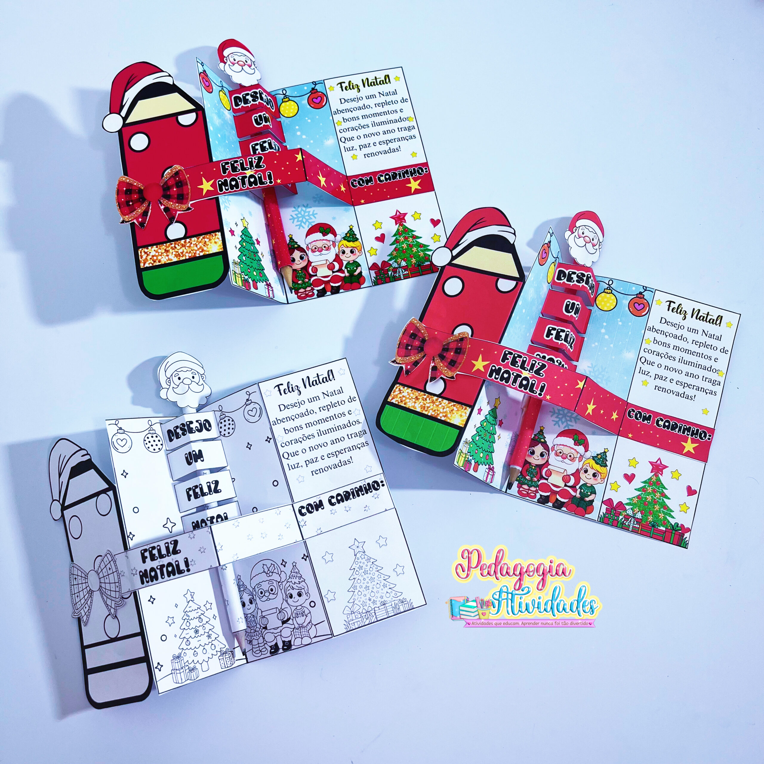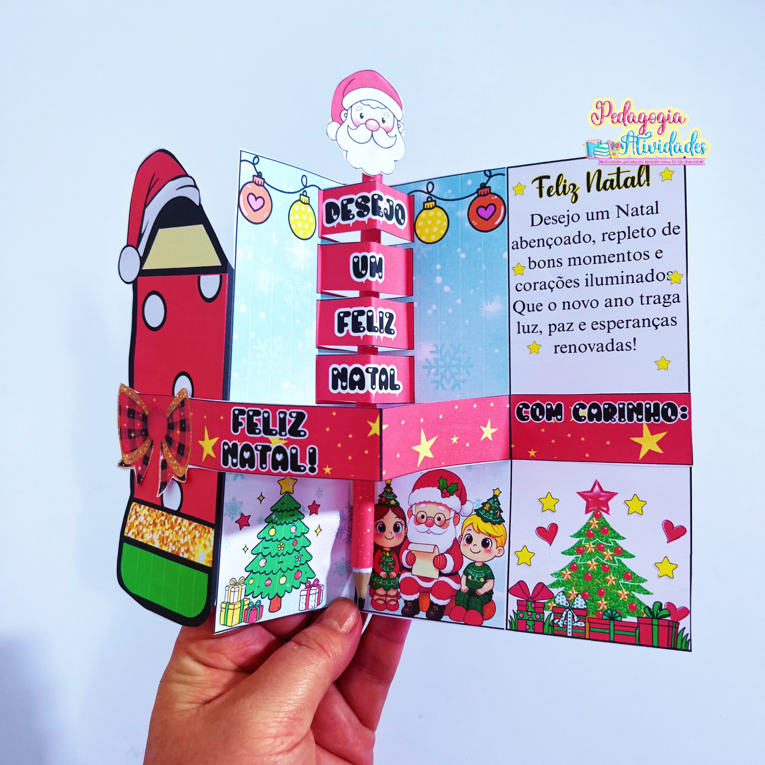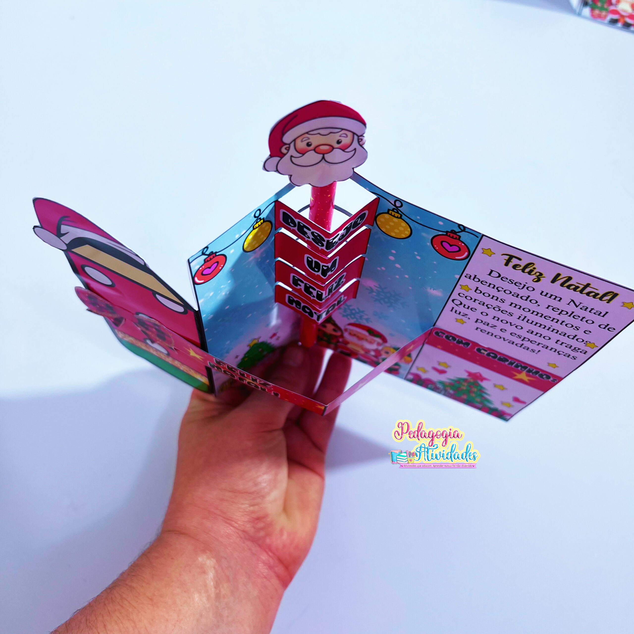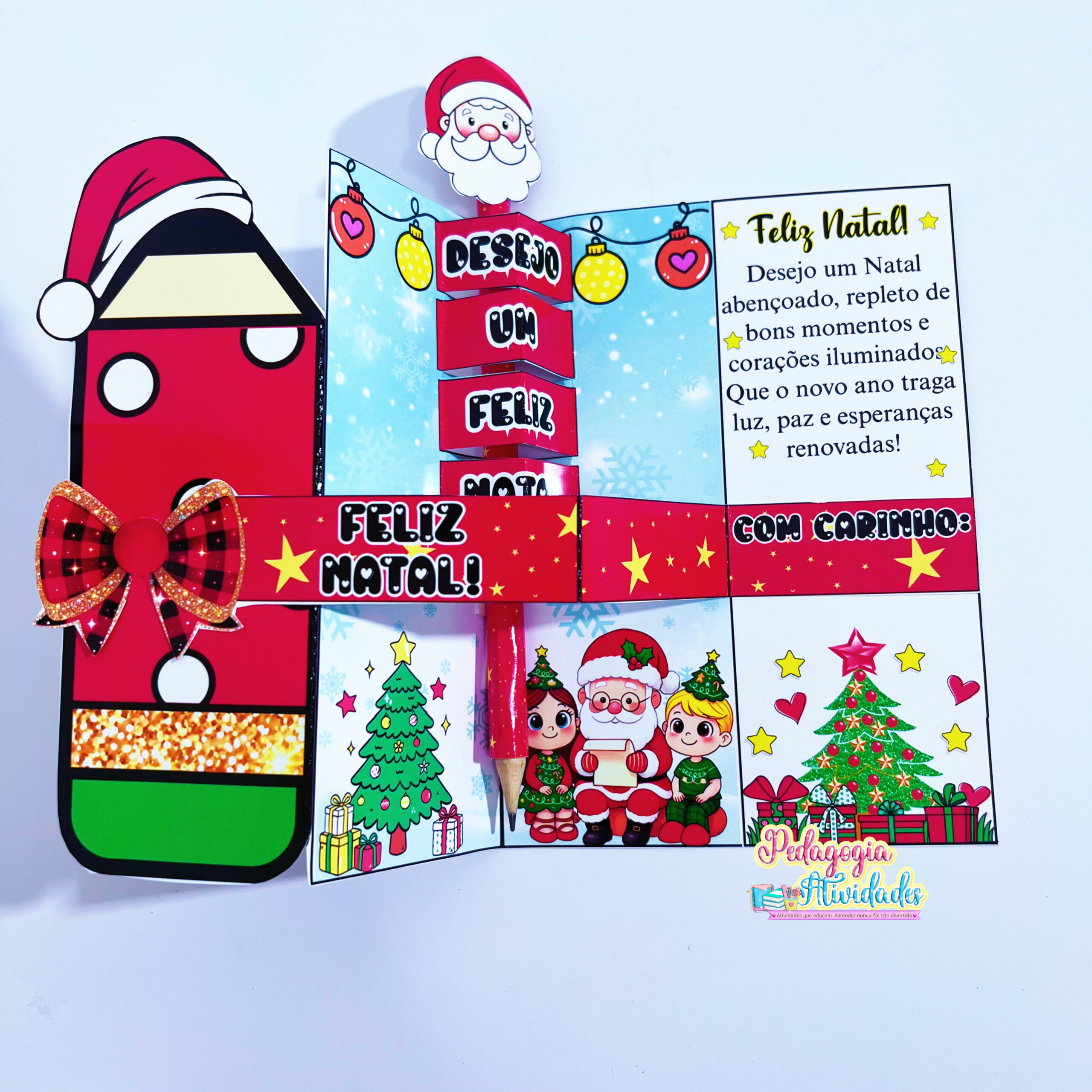 Ao abrir, uma frase salta em 3D, revelando toda a magia do Natal! E o toque final? Um lápis encapado com o rostinho do Papai Noel na ponta, que transforma o presente em um mimo inesquecível! ❤️