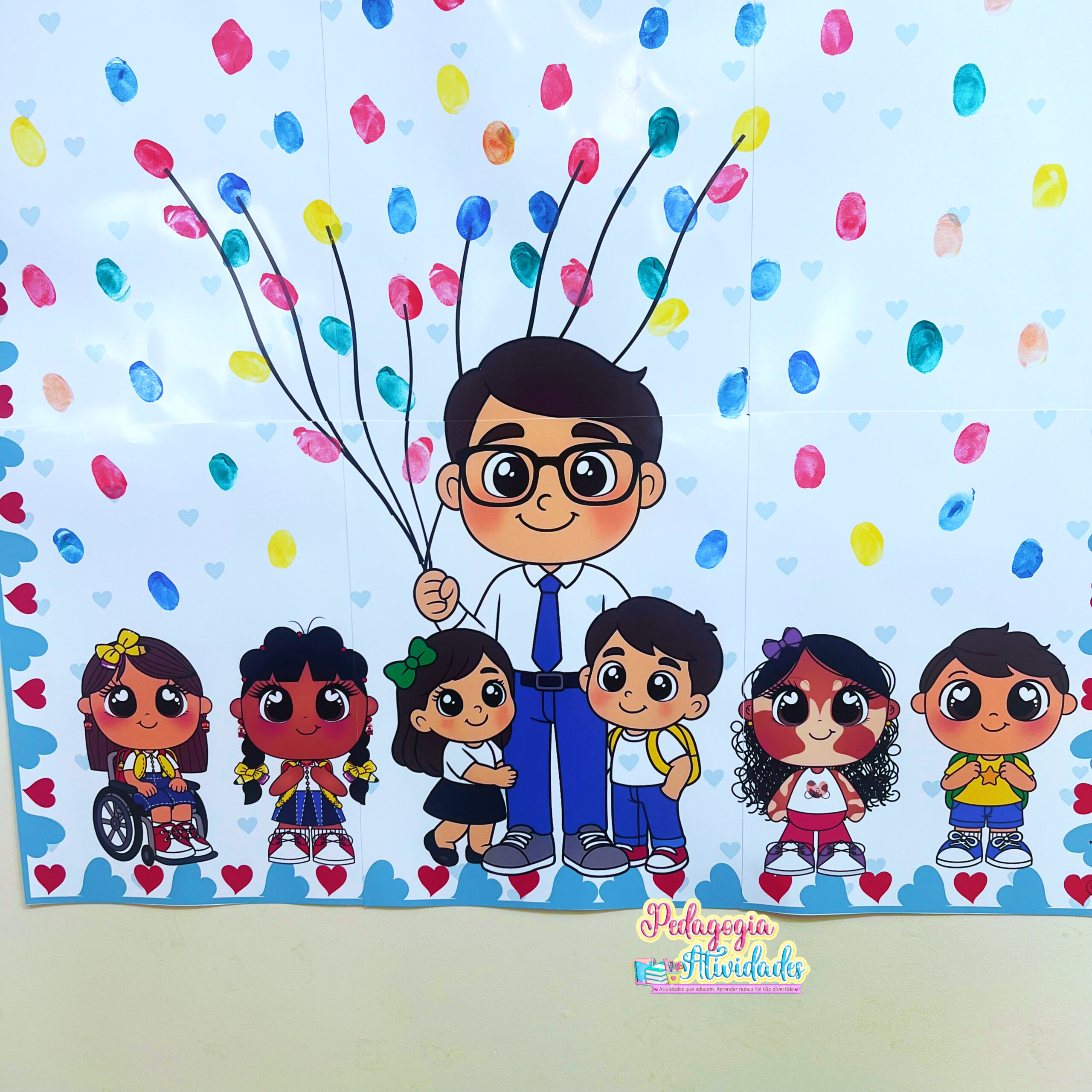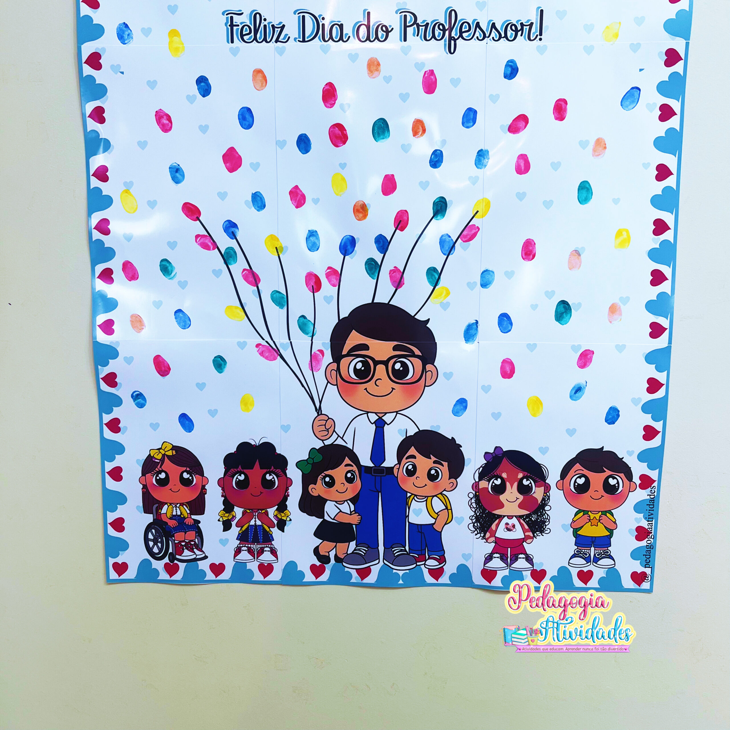 👩‍🏫👨‍🏫 Nesse cartaz especial, as crianças carimbam suas digitais com tinta guache ao redor da imagem do professor ou da professora com os alunos, criando uma lembrança única e emocionante!
