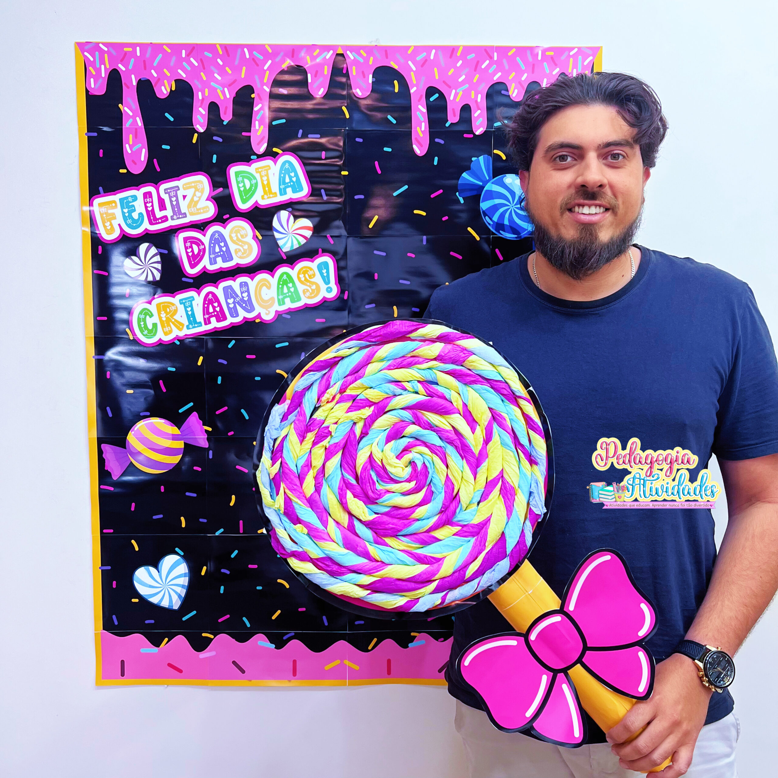O painel traz um big pirulito gigante e uma balinha feita de bexiga, criando um clima lúdico e doce para a criançada tirar fotos incríveis e registrar momentos inesquecíveis.