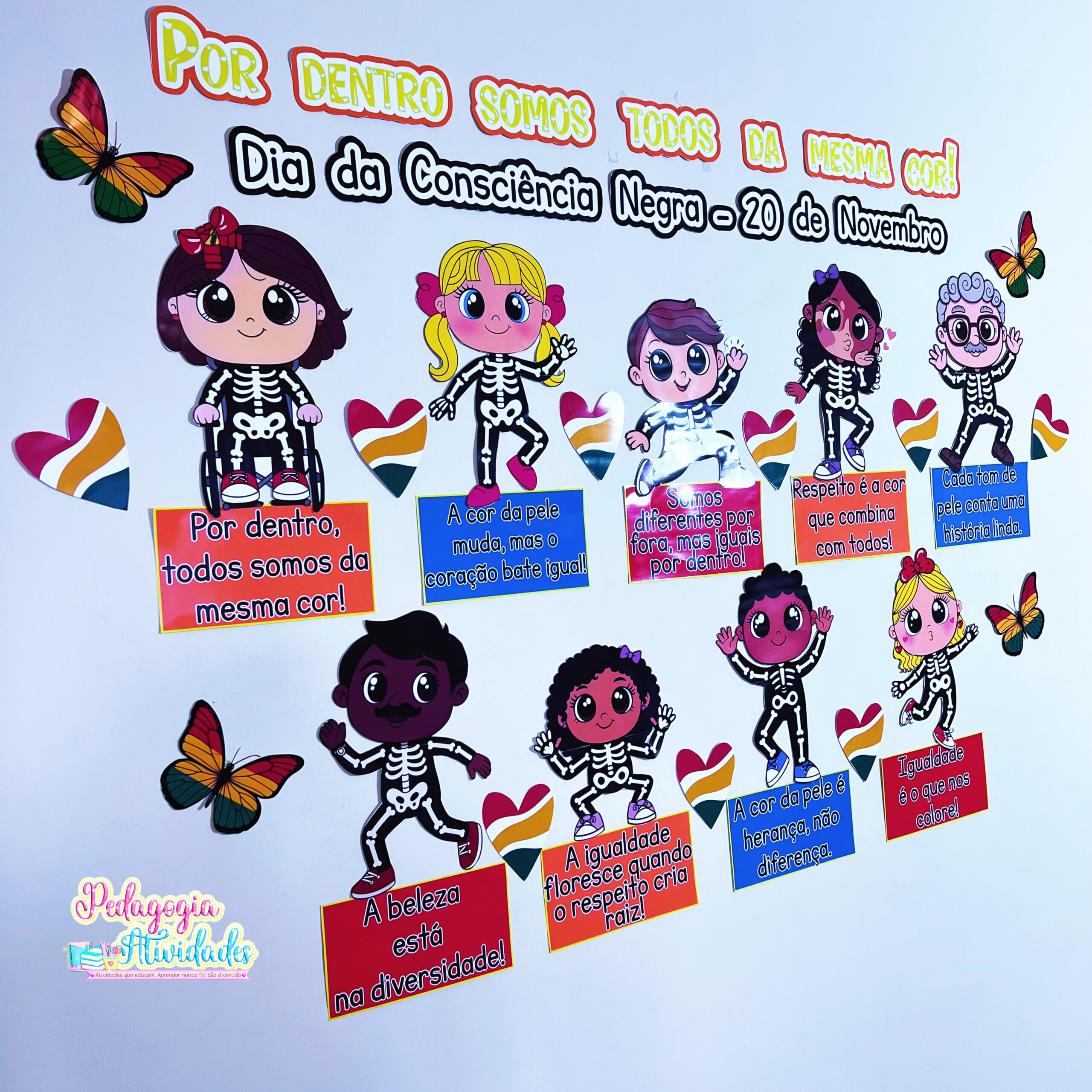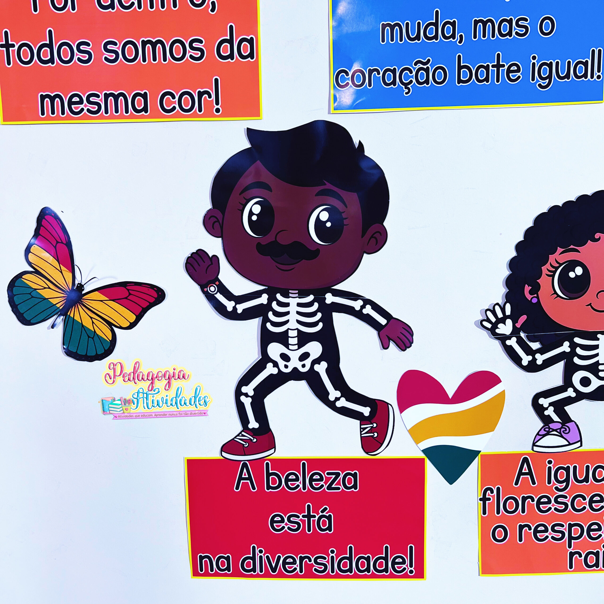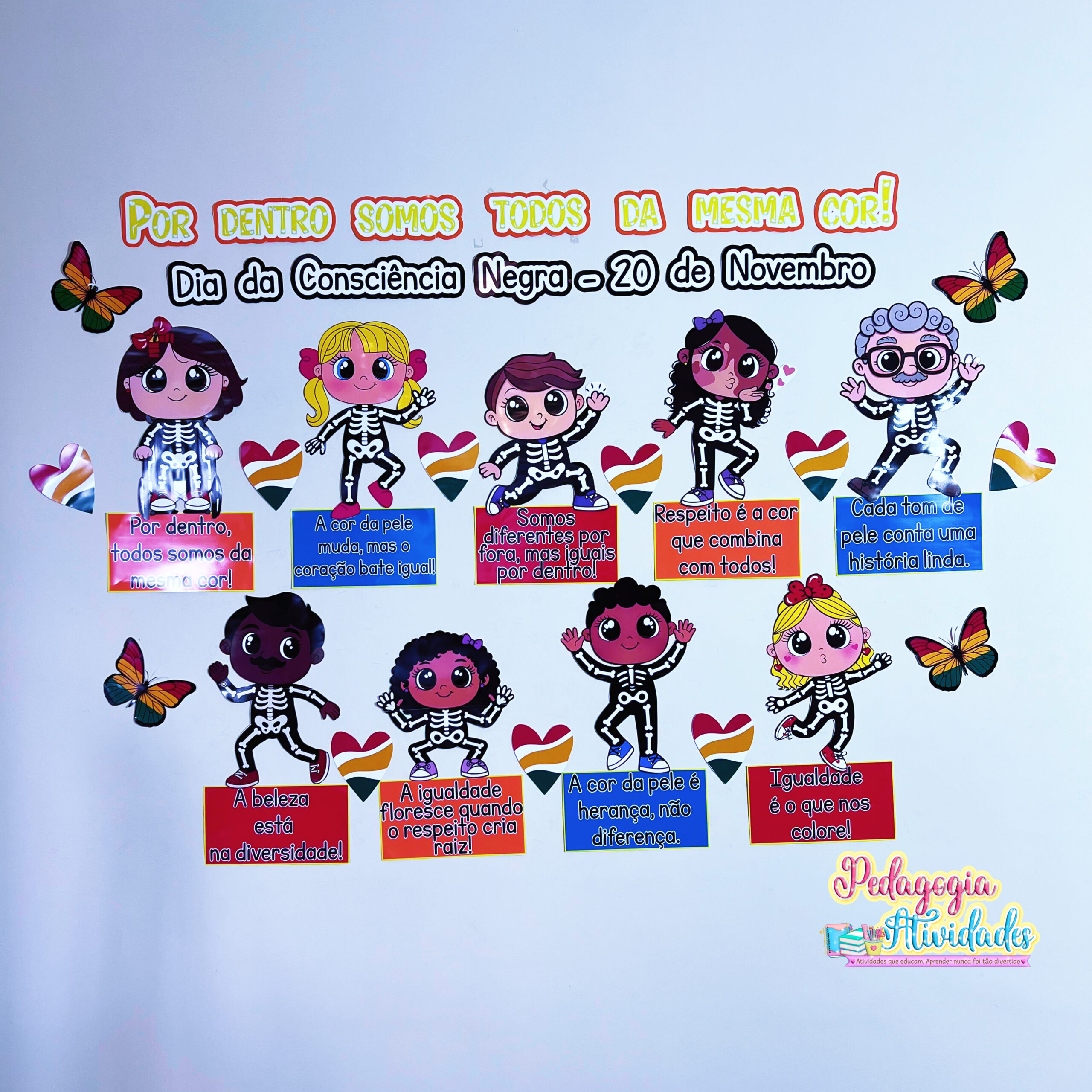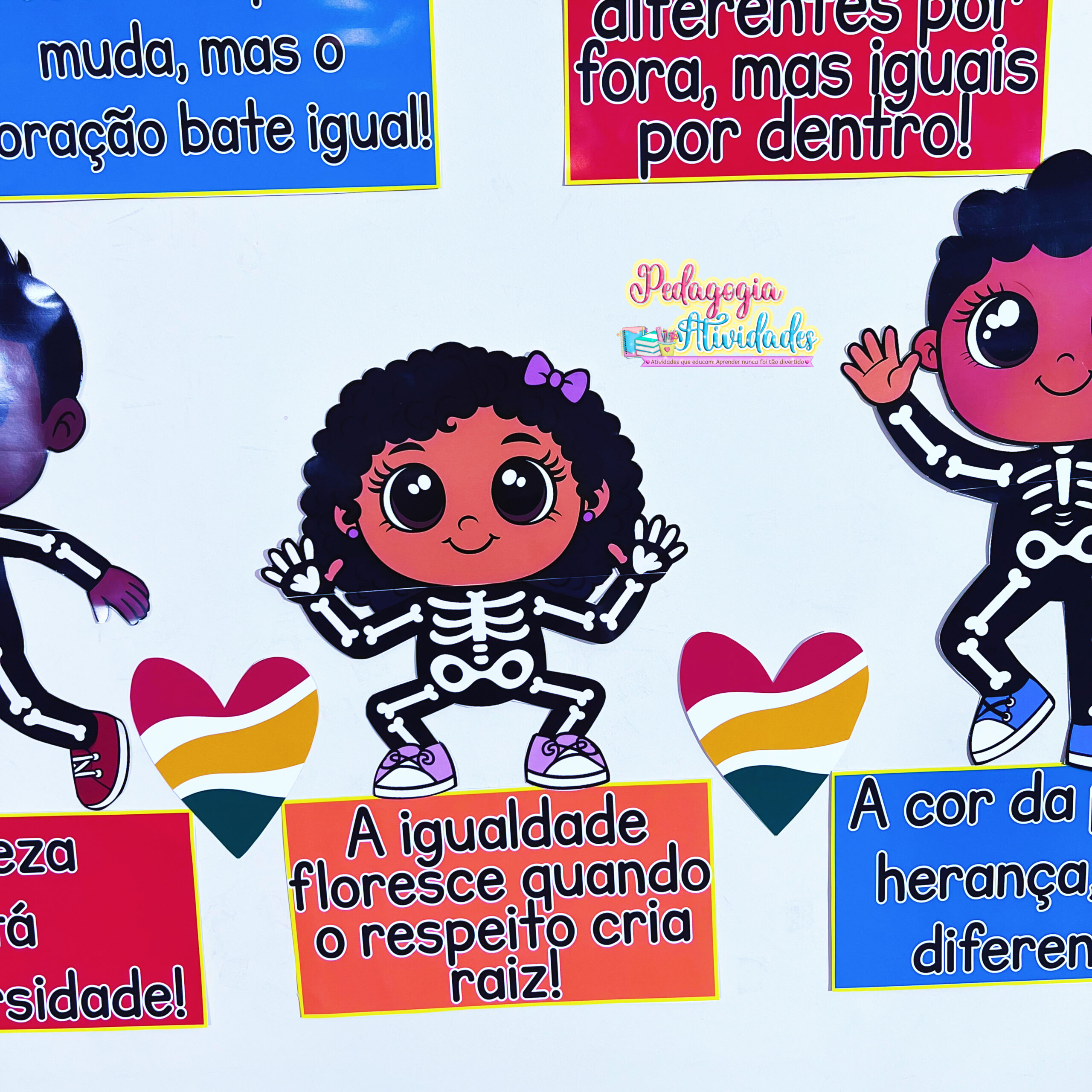 O painel apresenta crianças com diferentes tons de pele, todas vestidas de esqueletos, representando que por dentro somos todos iguais, independentemente da cor da pele. Uma mensagem poderosa para inspirar alunos e professores! 🖤✨
