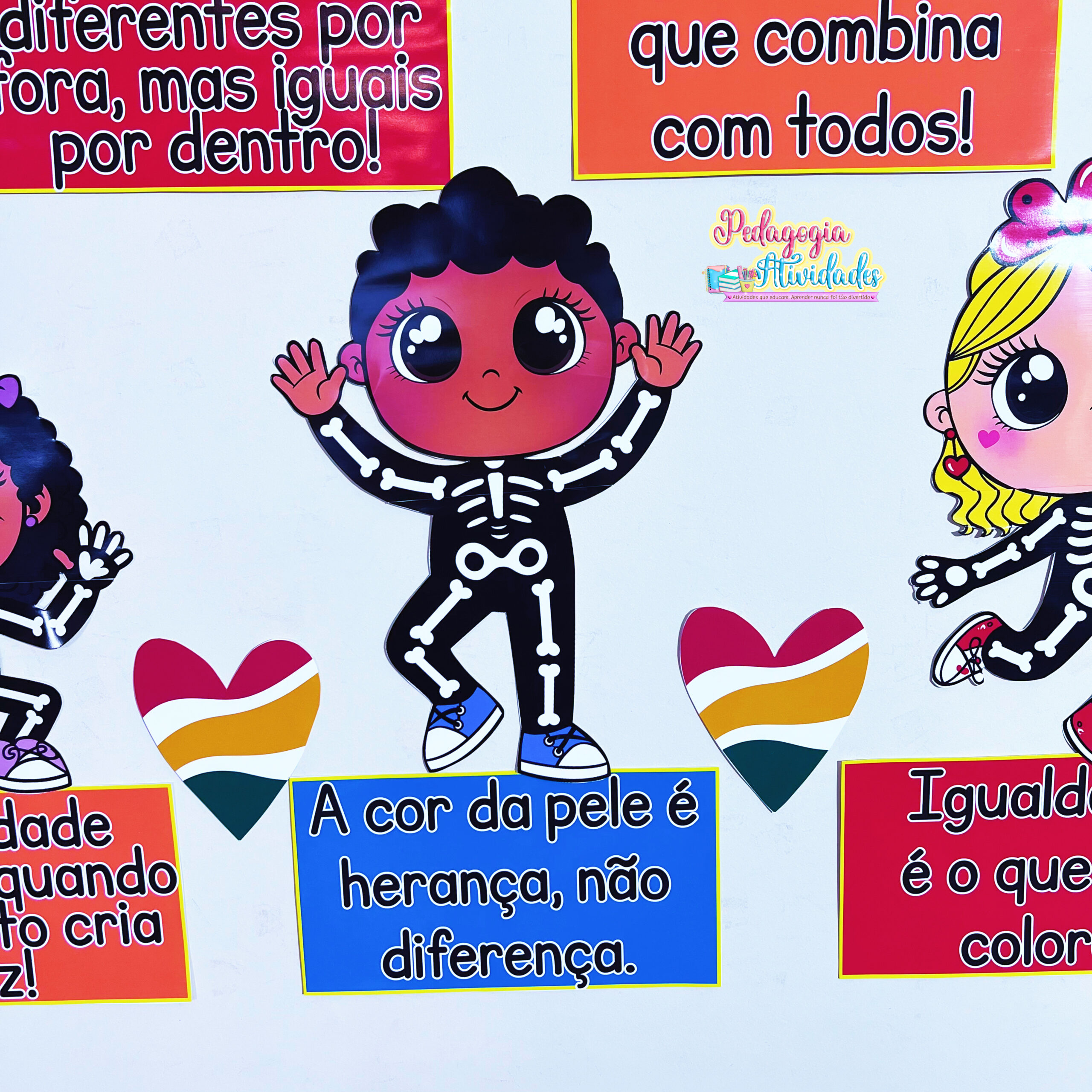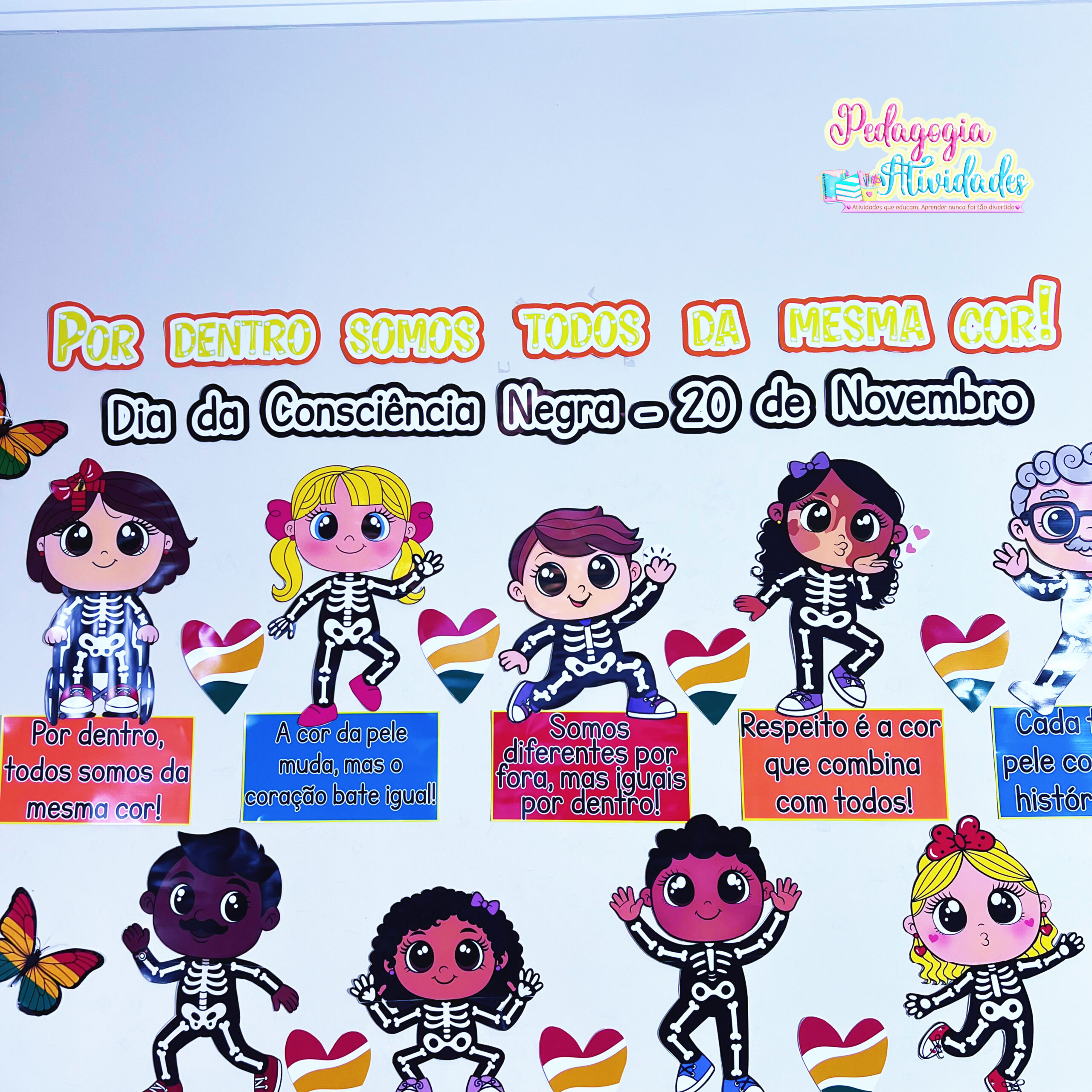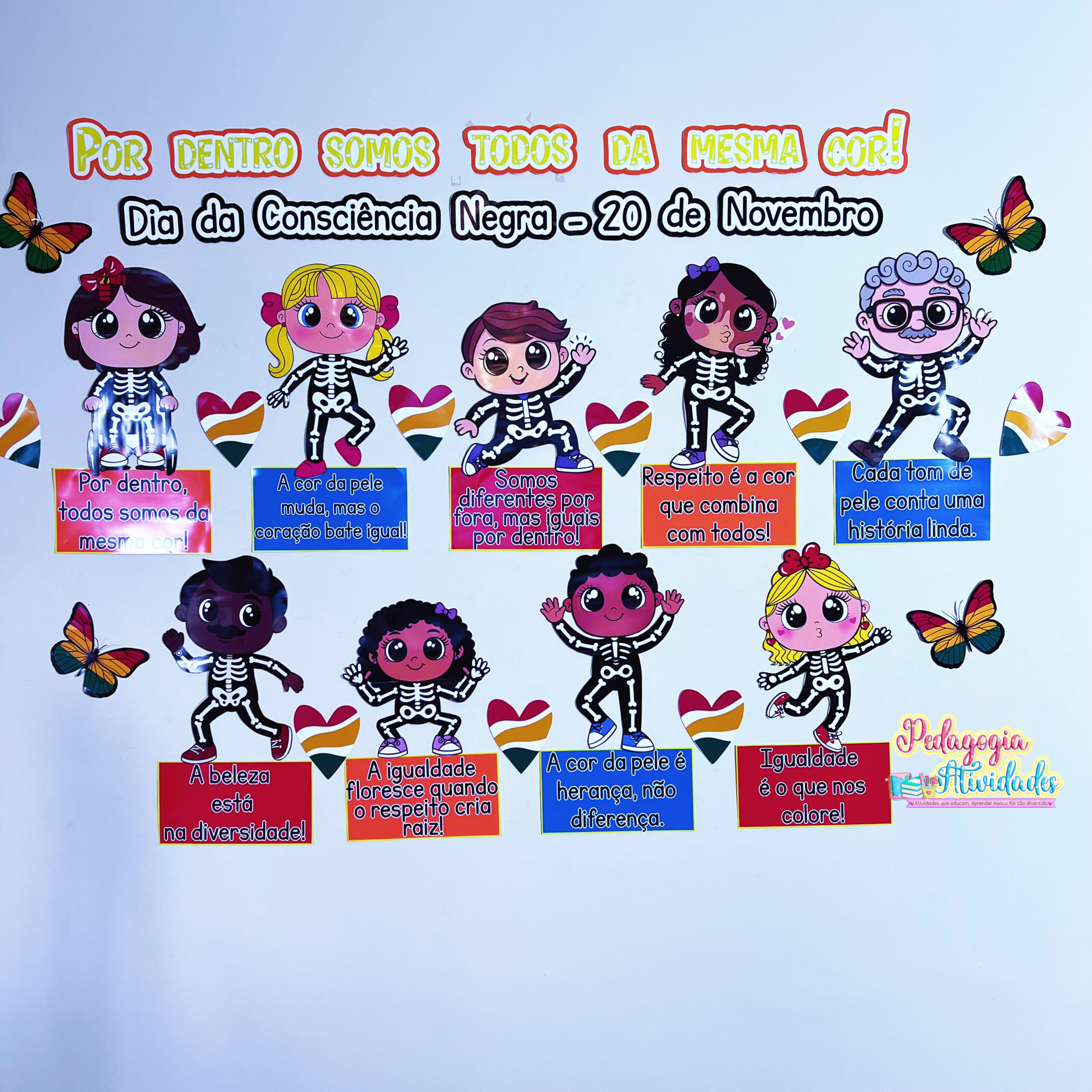 O painel apresenta crianças com diferentes tons de pele, todas vestidas de esqueletos, representando que por dentro somos todos iguais, independentemente da cor da pele. Uma mensagem poderosa para inspirar alunos e professores! 🖤✨