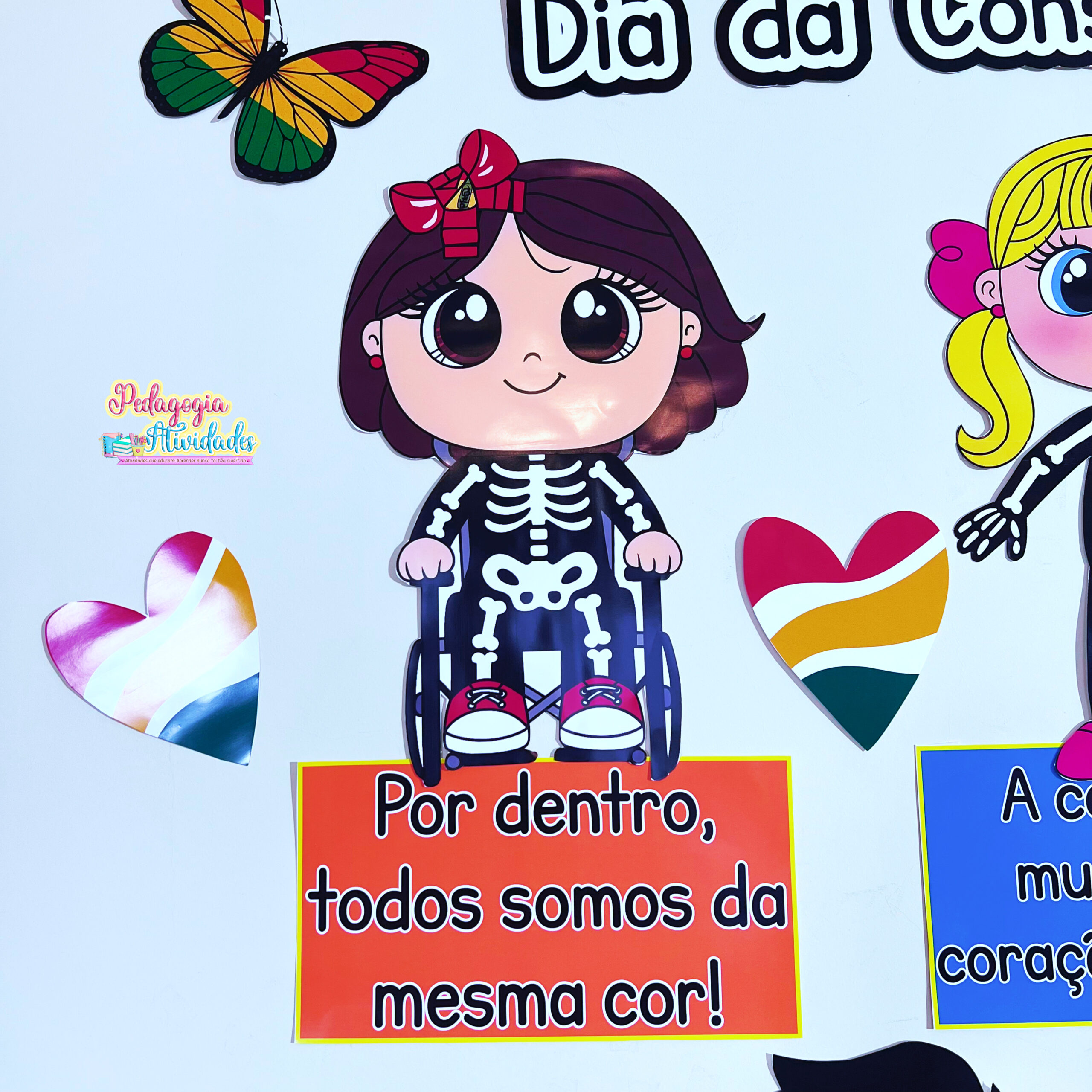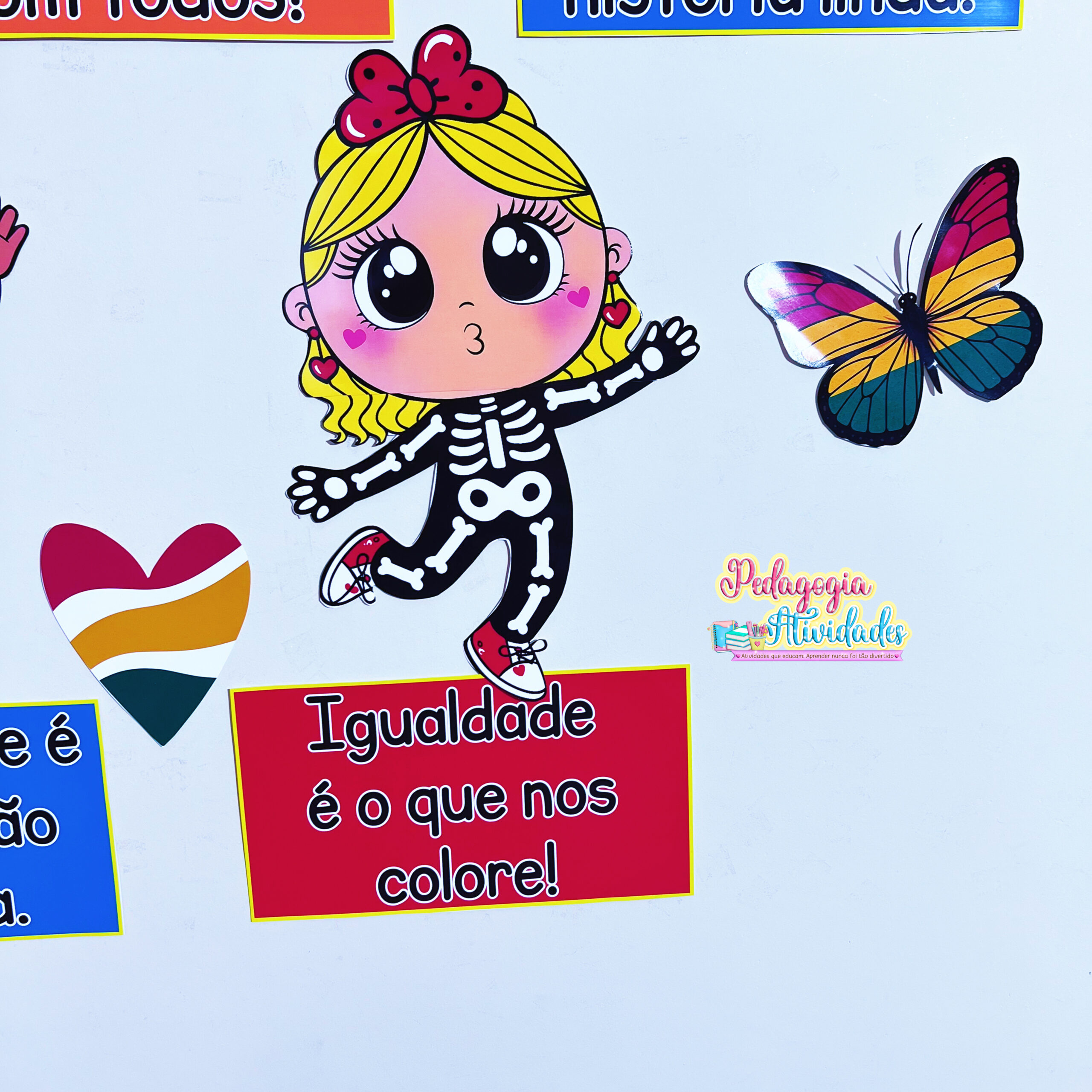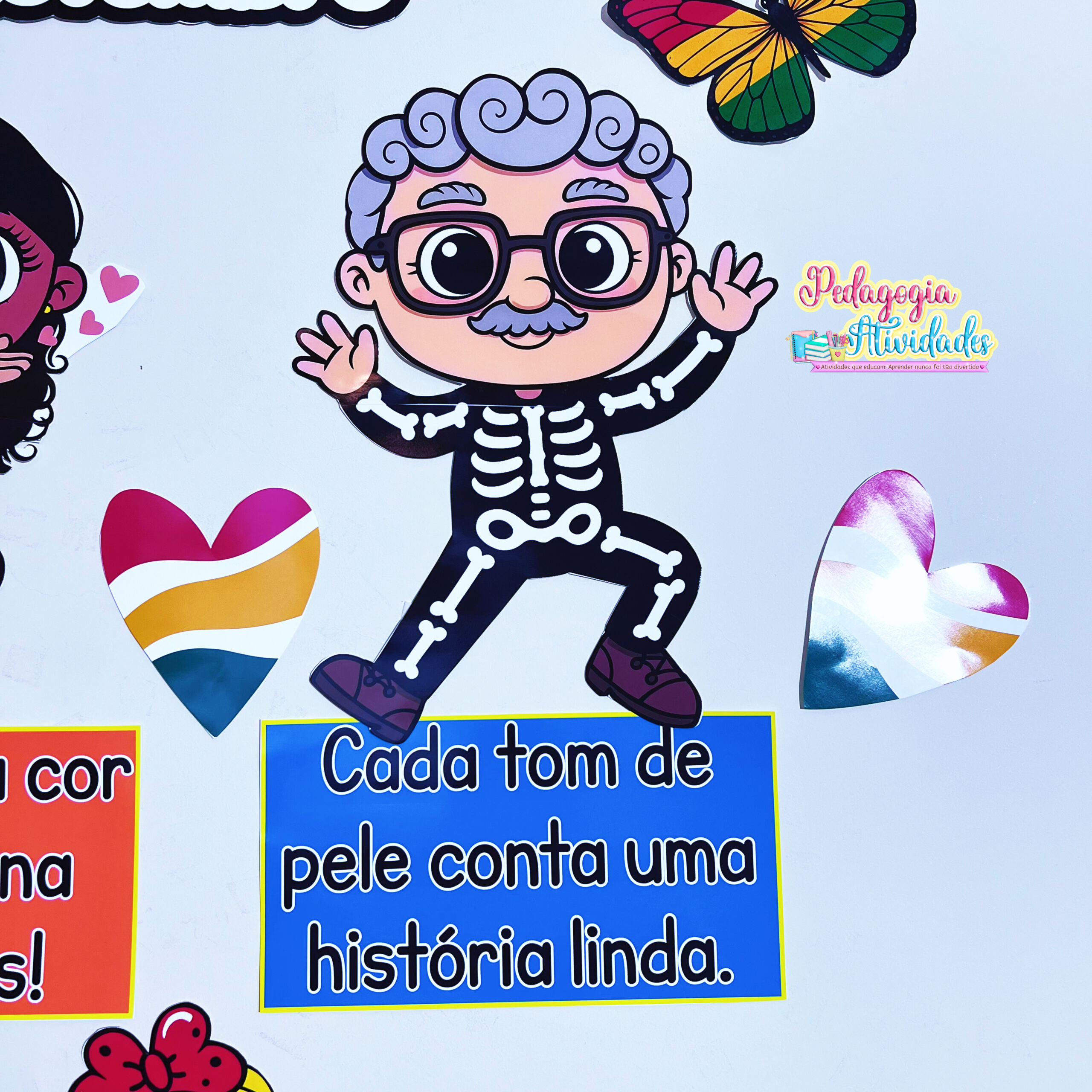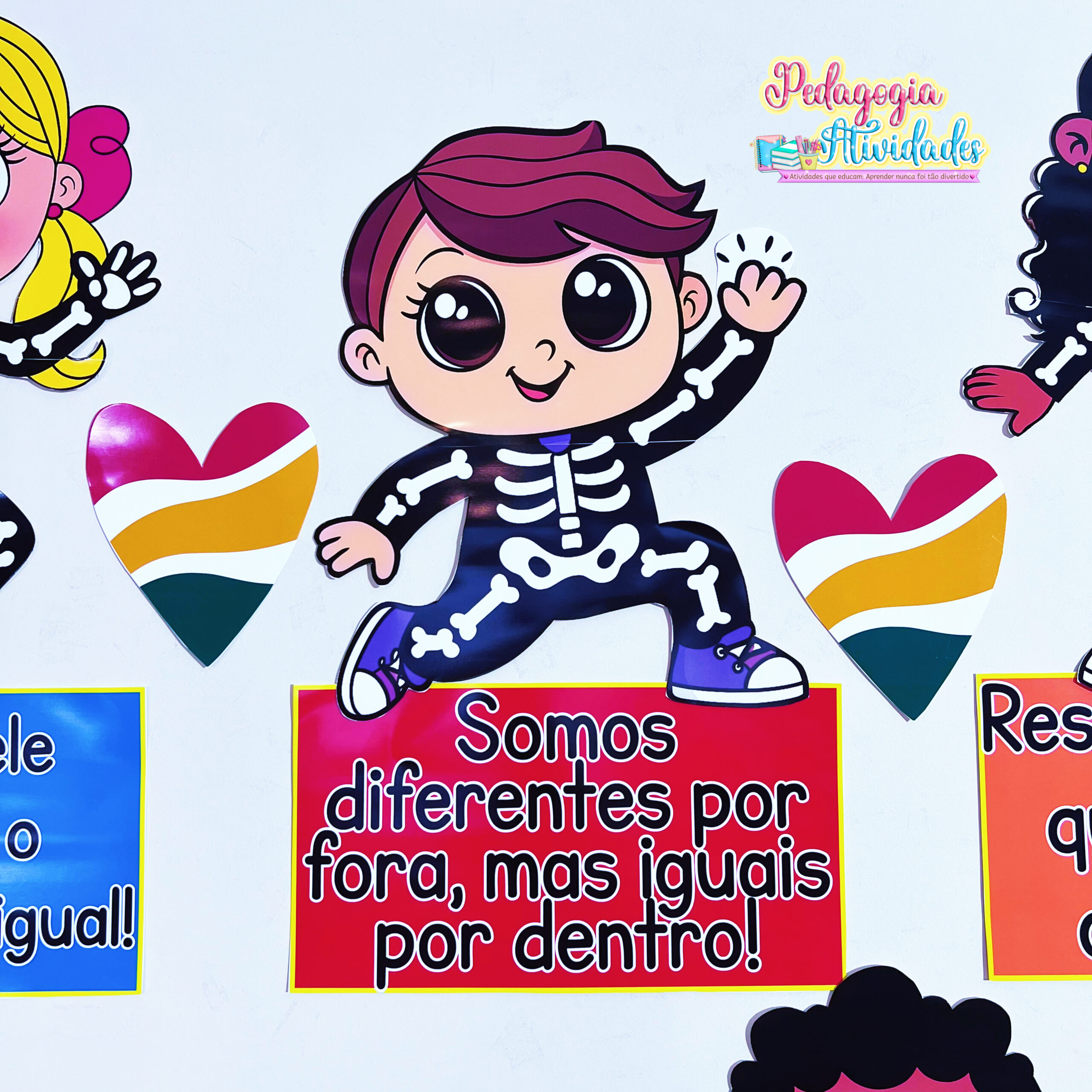 O painel apresenta crianças com diferentes tons de pele, todas vestidas de esqueletos, representando que por dentro somos todos iguais, independentemente da cor da pele. Uma mensagem poderosa para inspirar alunos e professores! 🖤✨