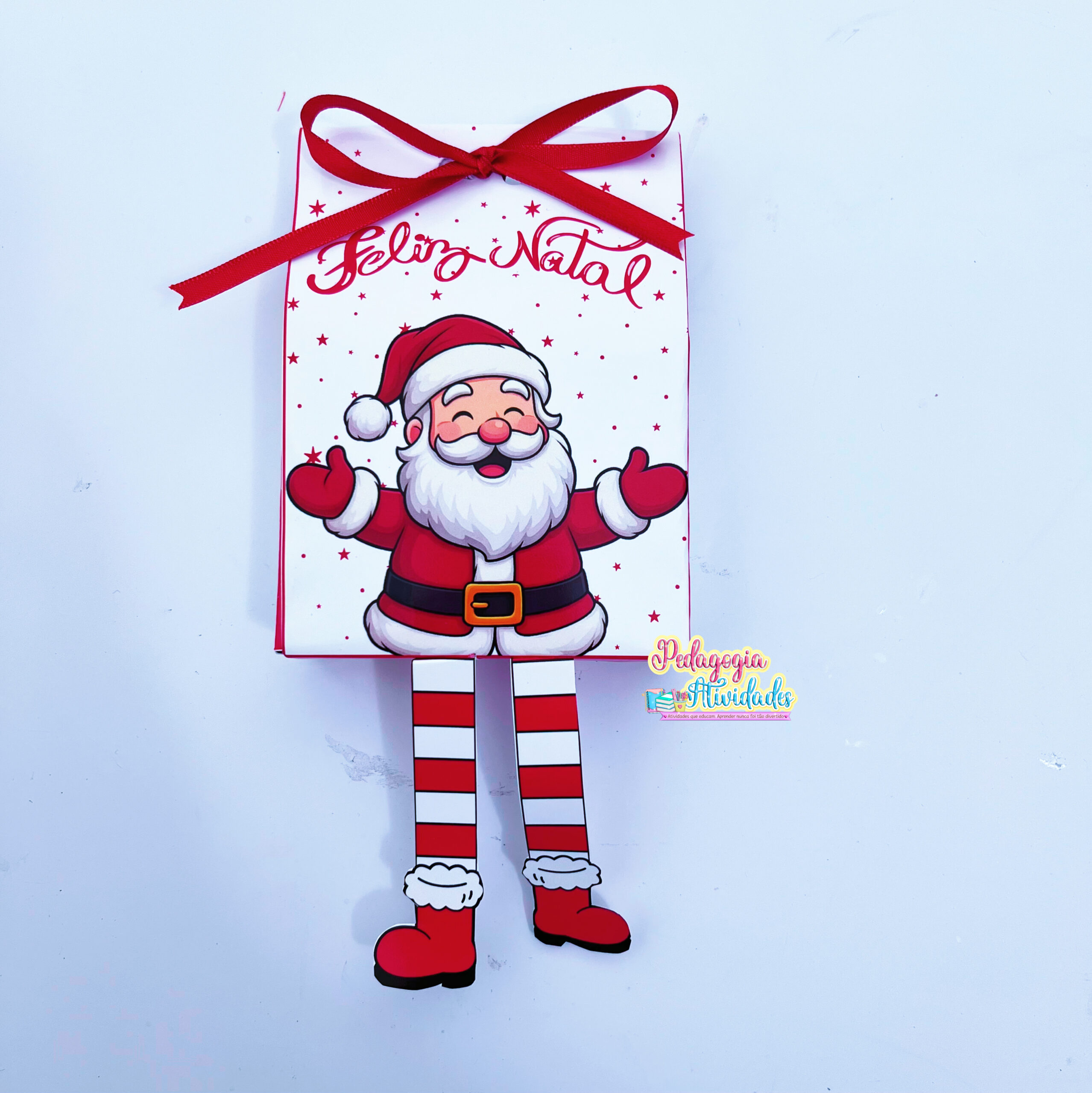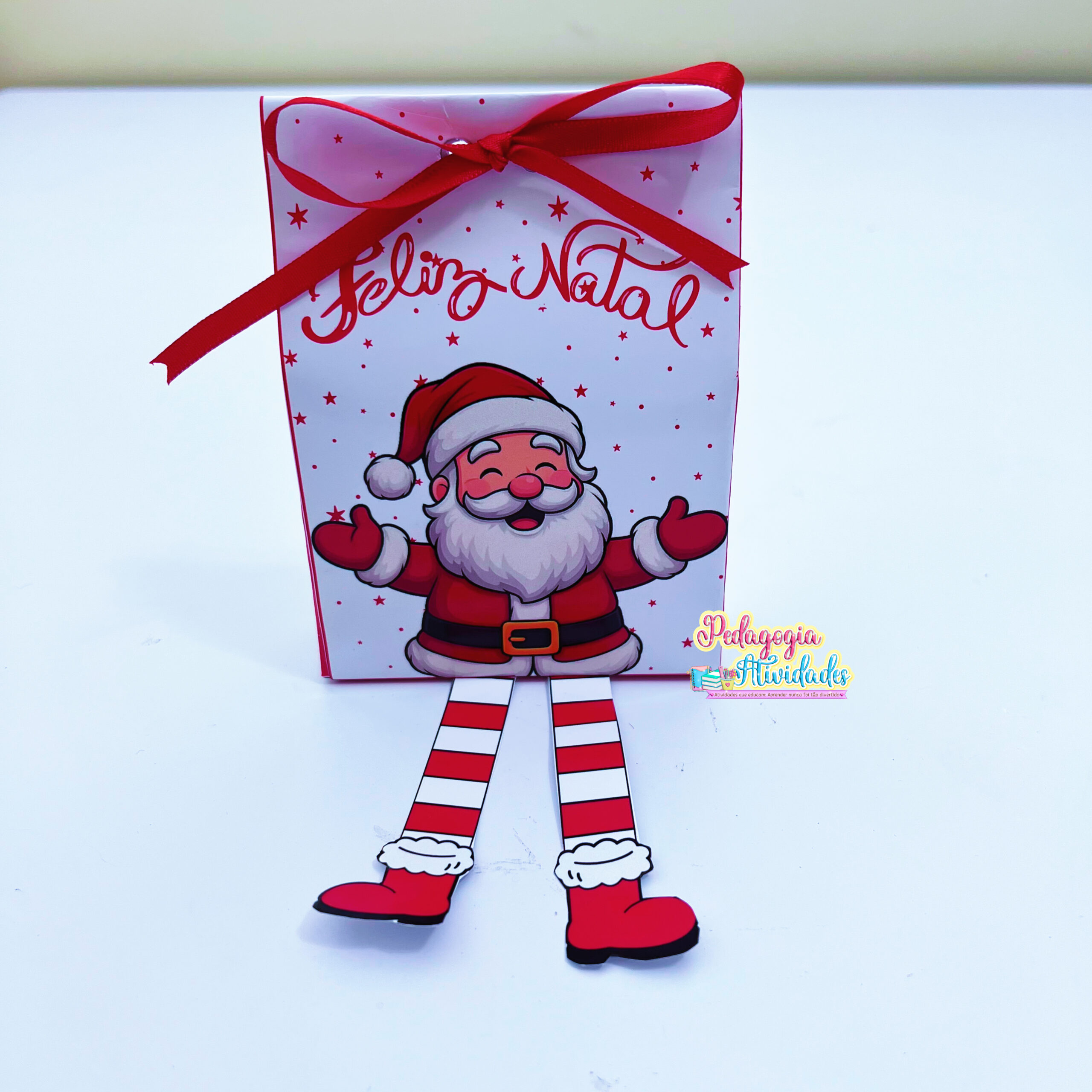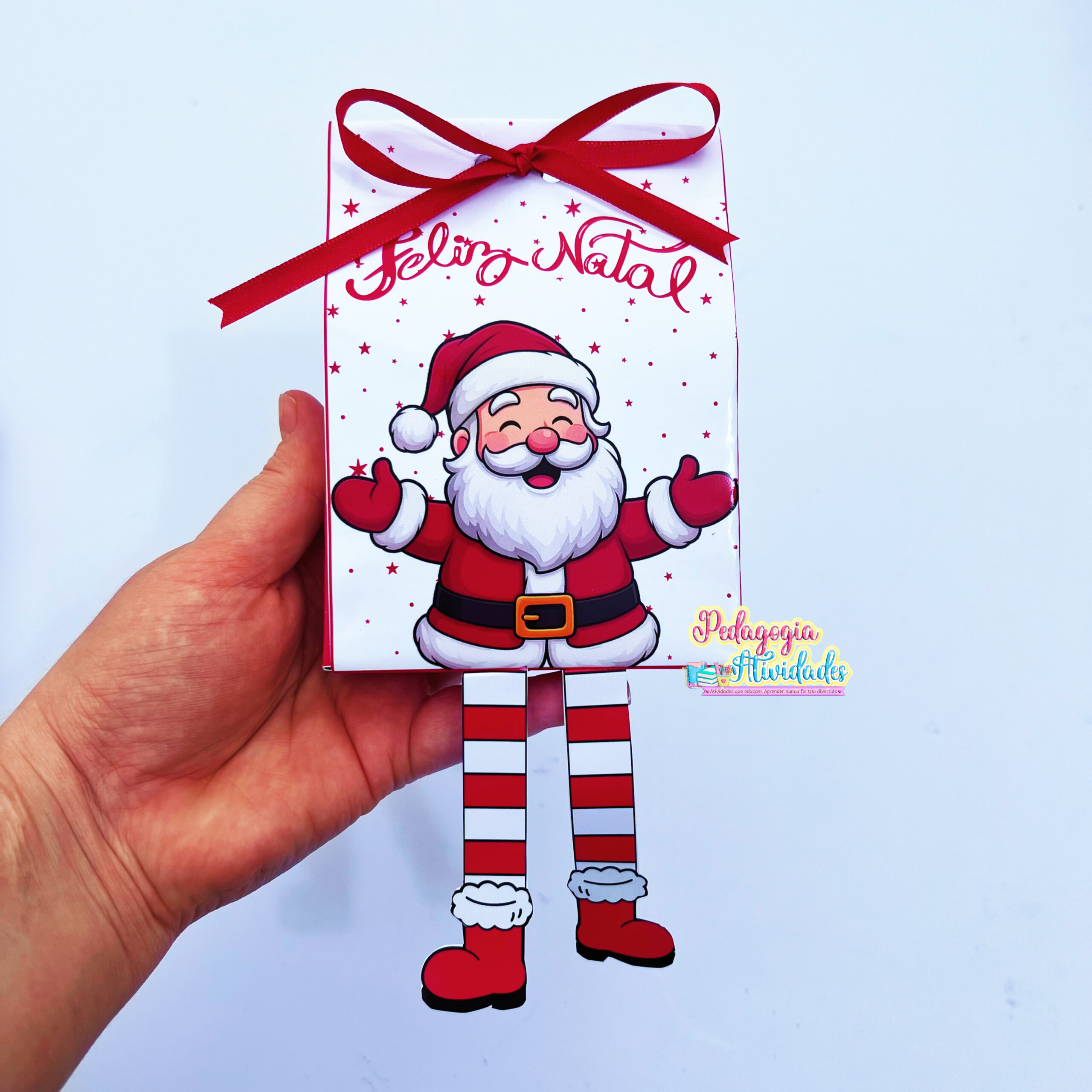 A sacolinha traz as perninhas móveis do Papai Noel, que balançam enquanto a criança segura — um charme irresistível que faz todo mundo sorrir!